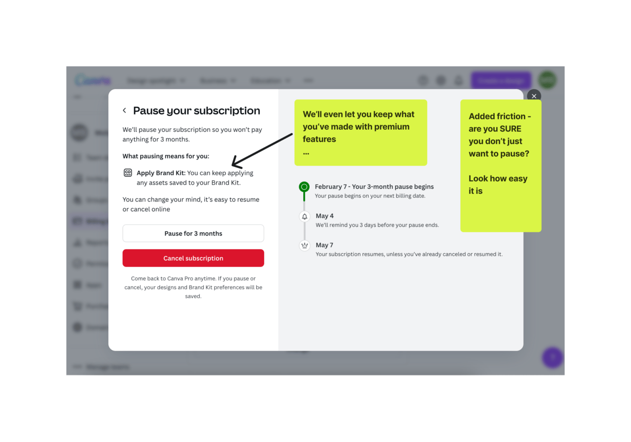 Keeps the door open: Make it easy to pause or downgrade so users can come back when they’re ready. If they gotta go, let them. But don’t burn the bridge with a high-friction exit.