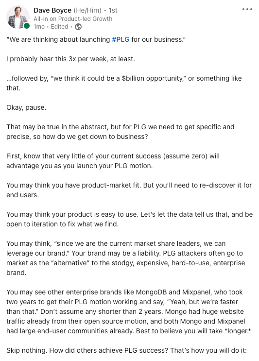 Dave explores and provides the direct, humbling advice we all need for us PLG folks who just "want to go PLG".